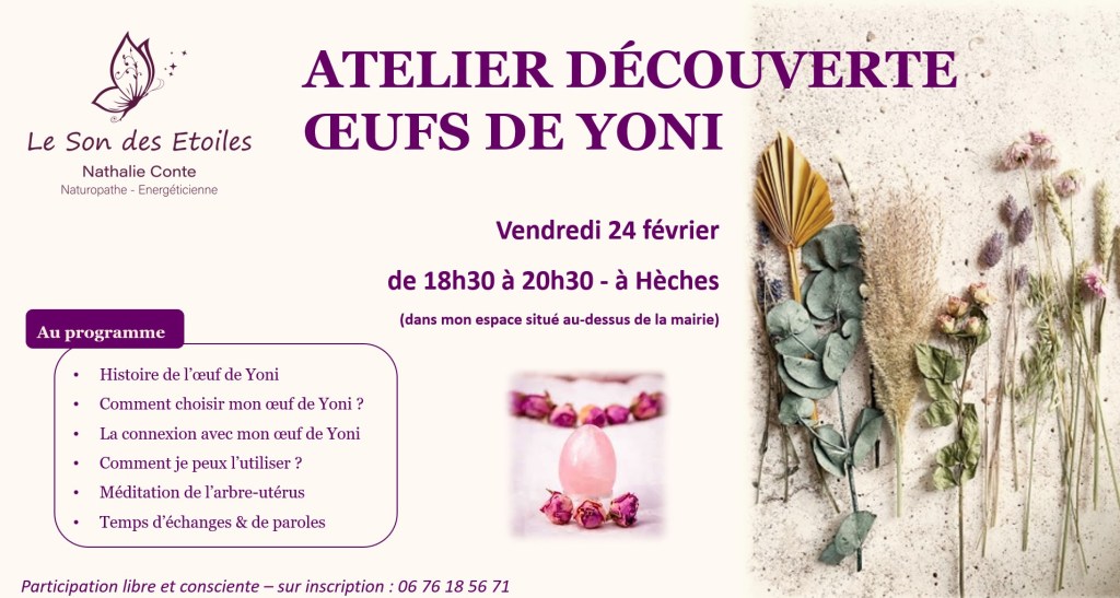 Un nouvel atelier de découverte de la pratique de l’œuf de Yoni fin avril, dans mon espace à Hèches.