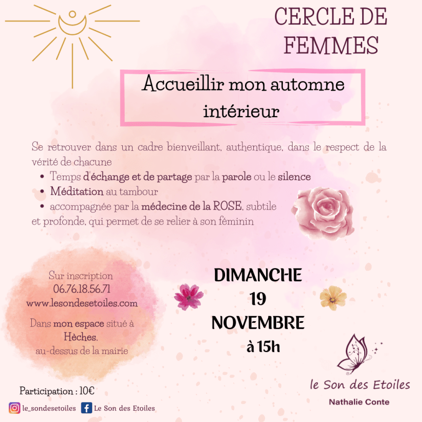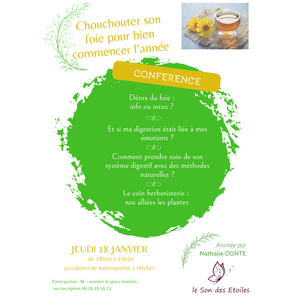Groupe : 6 personnes maximum, sur inscription par email nathalieconte.naturoapthe@gmail.com ou SMS 06.76.18.56.71